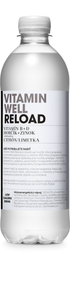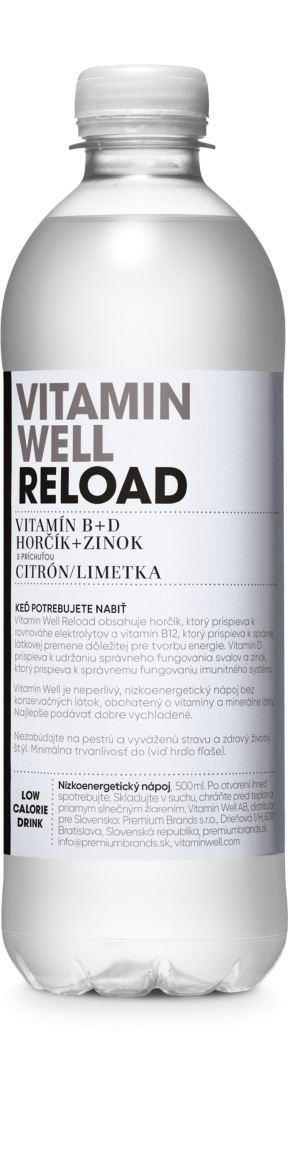 Príchuť Citrón a Limetka KEĎ POTREBUJETE NABIŤ Vitamin Well Reload obsahuje horčík, ktorý prispieva k rovnováhe elektrolytov a vitamín B12, ktorý prispieva k správnej látkovej premene dôležitej pre tvorbu energie. Vitamín D prispieva k udržaniu správneho fungovania svalov a zinok, ktorý prispieva k správnemu fungovaniu imunitného systému. Zloženie voda, fruktóza, regulátor kyslosti (kyselina citrónová, uhličitan vápenatý), vitamíny (D, E, niacín, kyselina listová, B12, biotín, kyselina pantotenová), minerálne látky (horčík, zinok, selén), arómy. Výživové údaje na 100g/100ml energia 71 kJ (17 kcal) tuky 0 g z toho nasýtene mastné kyseliny 0 g sacharidy 4,2 g z toho cukry 4,2 g bielkoviny 0 g vláknina 0 g soľ 0,03 g